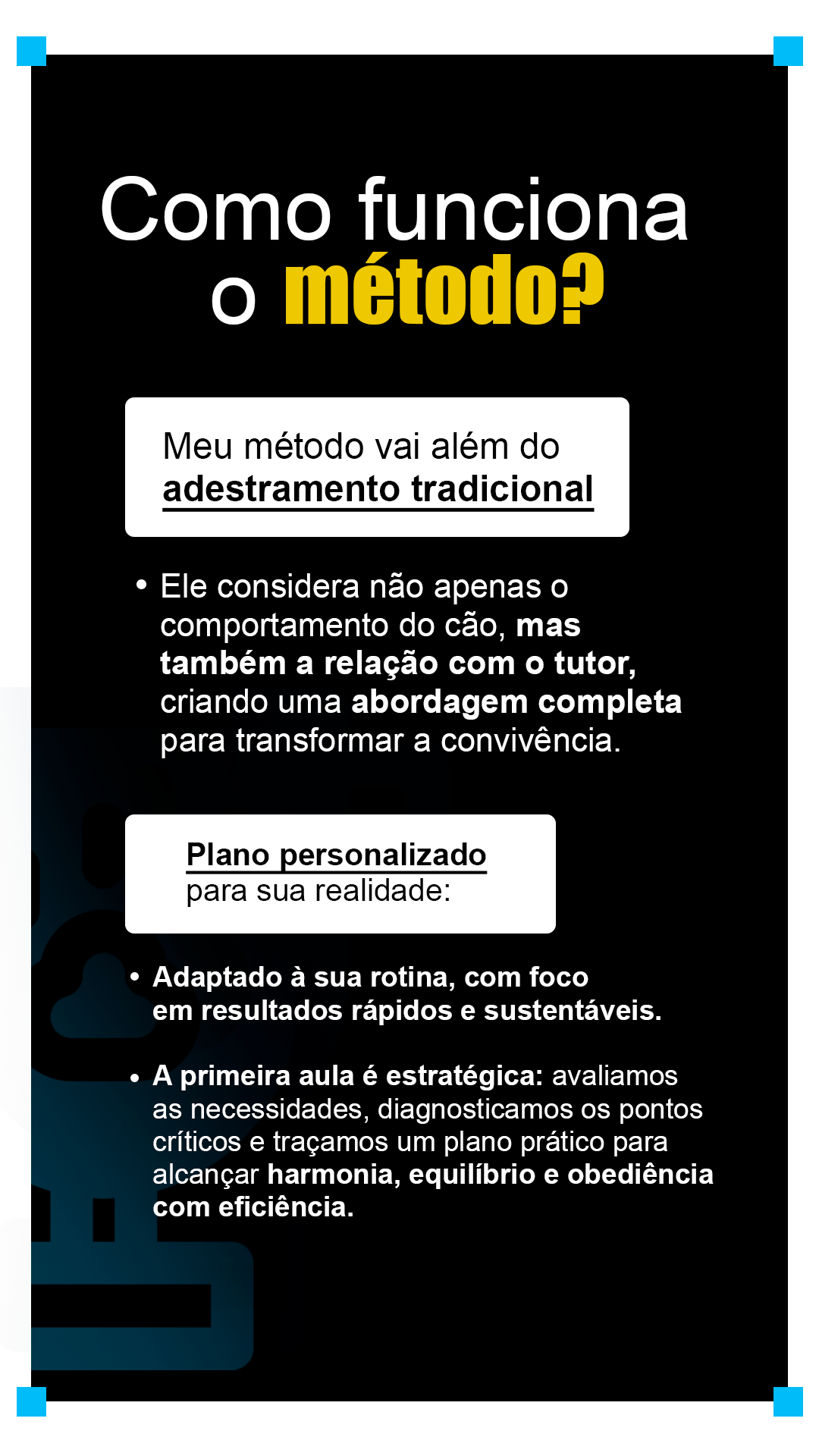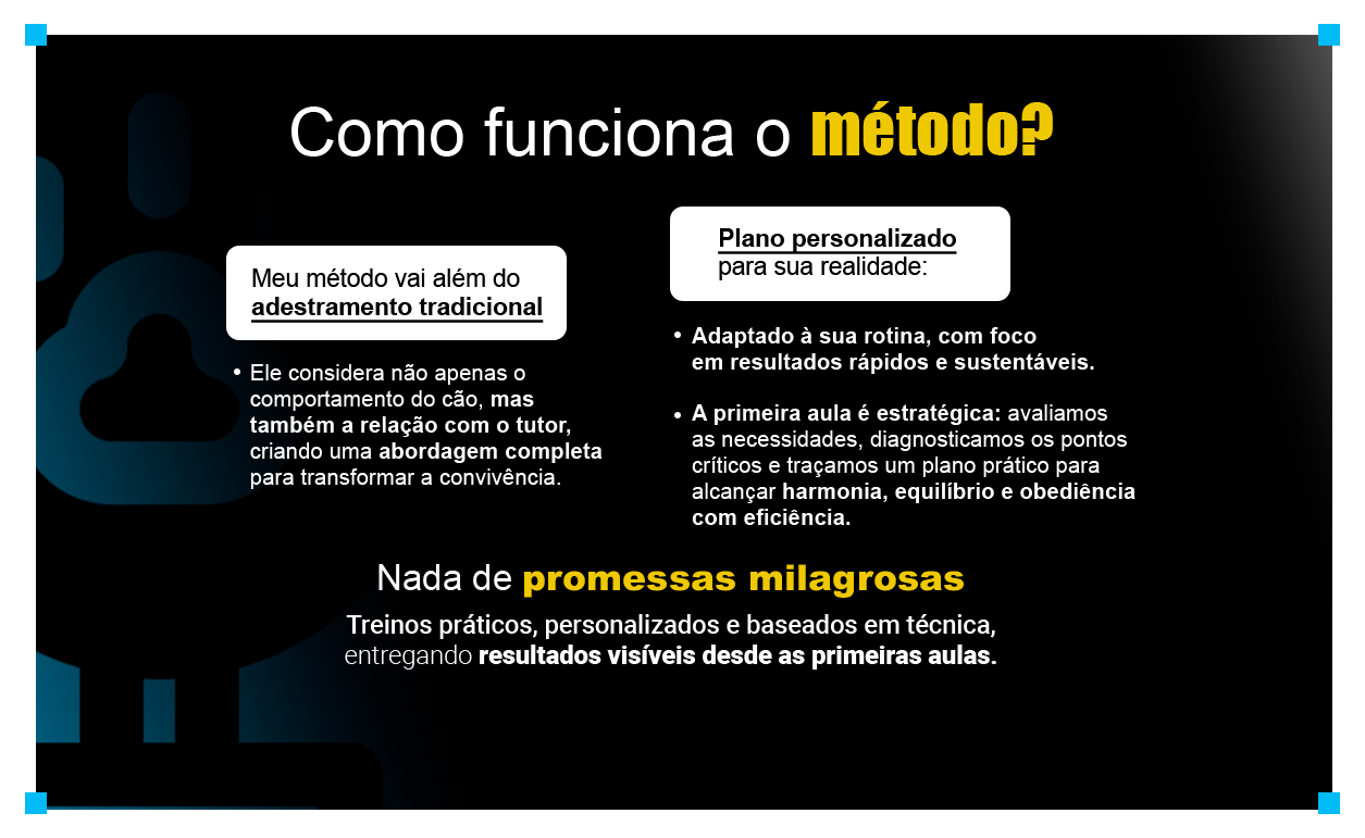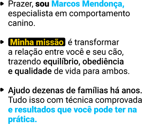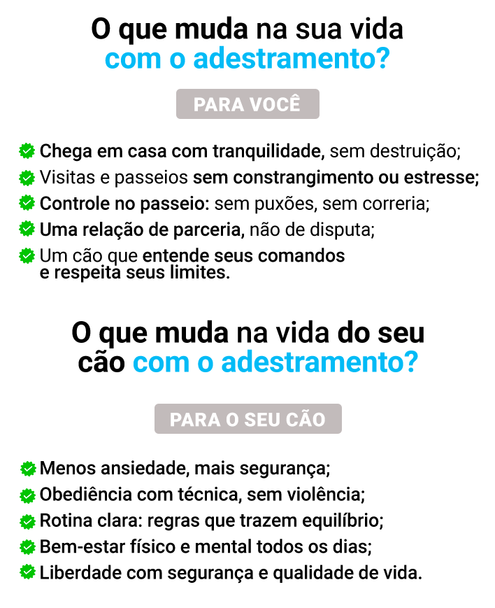 Com o Adestramento, resolva latidos, pulos, ansiedade e passeios caóticos com um método rápido, eficaz e tenha resultados visíveis nas primeiras aulas.